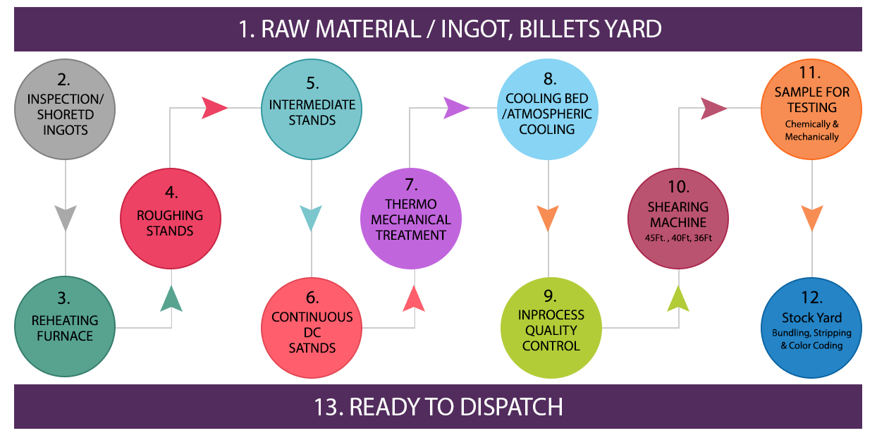 In this final stage, cooling takes place on the cooling bed where the final structure consists of hard outer periphery making it more stronger, more corrosion resistant and fire resistant. The soft inner surface gives the metal ductility (more bendability & elongation), and better fatigue resistance able to withstand natural calamities and other forces better.